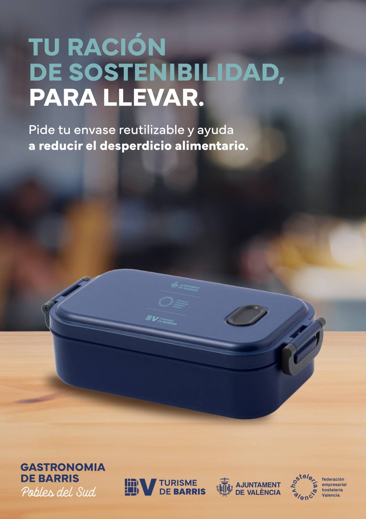 Los establecimientos que forman parte de la acción han recibido envases reutilizables para repartir entre los clientes que deseen llevarse la comida sobrante. Así, si el comensal no termina su ración puede llevársela en este recipiente que además podrá volver a usar en futuras ocasiones al acudir a establecimientos, contribuyendo activamente al cuidado del entorno y promoviendo un consumo responsable.